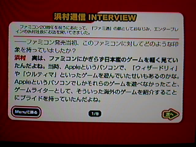 Beim ersten Menüpunkt wird die Geschichte des Famicoms illustriert. Mit Kommentaren von japanischen Branchenkennern und kurzen Ausschnitten aus Spielen wie" Super Mario Bros." oder " Adventure Island" wird dabei der Werdegang von Nintendos erster Konsole aufgezeigt und auf den großen Einfluss auf die späteren Videospielgenerationen aufmerksam gemacht.
