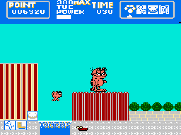 Seit 1978 sorgt ein dicker, fauler Kater namens Garfield in täglich erscheinenden Comic-Strips für Gelächter. Der bekennende Montag-Hasser blieb jedoch nicht nur Tageszeitungen vorenthalten, sondern erhielt sein eigenes Comic-Magazin, trat in verschiedenen Trick-Serien auf und schaffte es als Computeranimation gar auf die Kinoleinwand. Nur logisch, dass ein Cartoon-Star mit entsprechendem Bekanntheitsgrad auch diverse Videospiele spendiert bekam. Auch das Famicom wurde damals bereits mit einer Software-Version des orangefarbenen Katers bedacht. Schauen wir uns also mal an, was der relativ unbekannte Entwickler Towa Chiki aus der Lizenz machte.