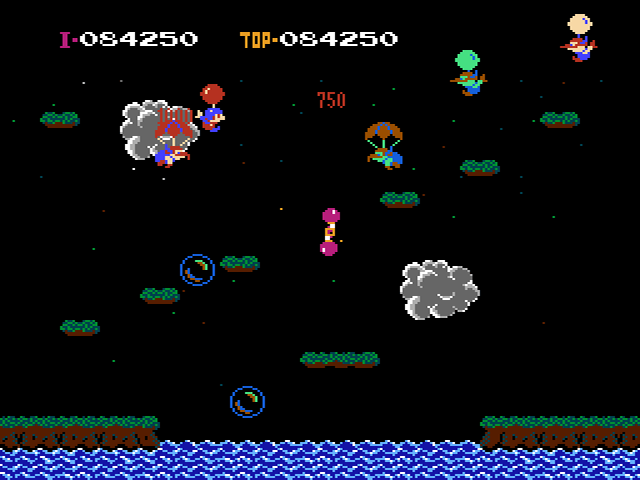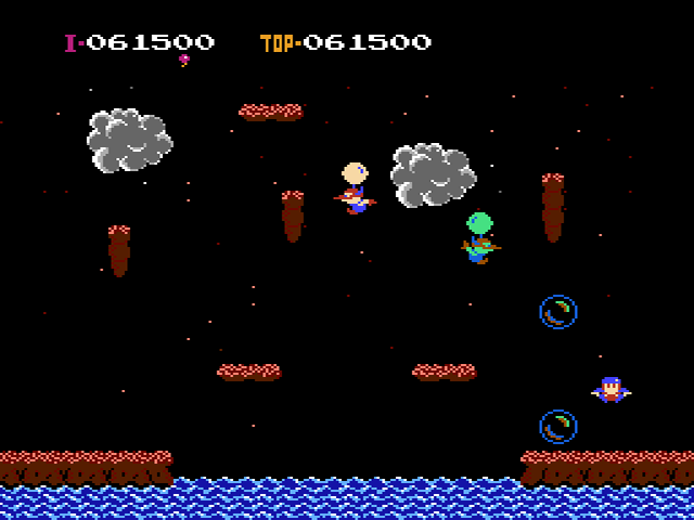Die Jagd nach dem Highscore wird hierbei durch weitere Elemente noch interessanter. So gibt das Einsammeln von umherfliegenden Seifenblasen Extrapunkte, und aus dunklen Wolken entspringen Blitze, die unserem Helden gleich bei einfacher Berührung den Garaus machen. In späteren Levels befinden sich sogar sich um die eigene Achse rotierende Propeller, die sowohl den Helden als auch seine Widersacher bei Berührung in unvorhergesehene Richtungen schleudern. Dieses Item bringt übrigens so viel Action und Willkür in die Auseinandersetzungen, dass Nintendo es Jahrzehnte später ebenfalls in die berühmte Smash Bros. Serie einbaute.
