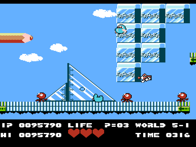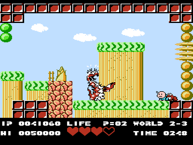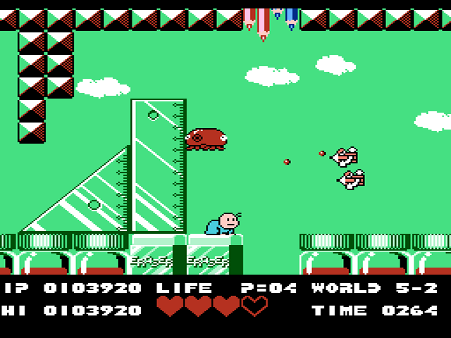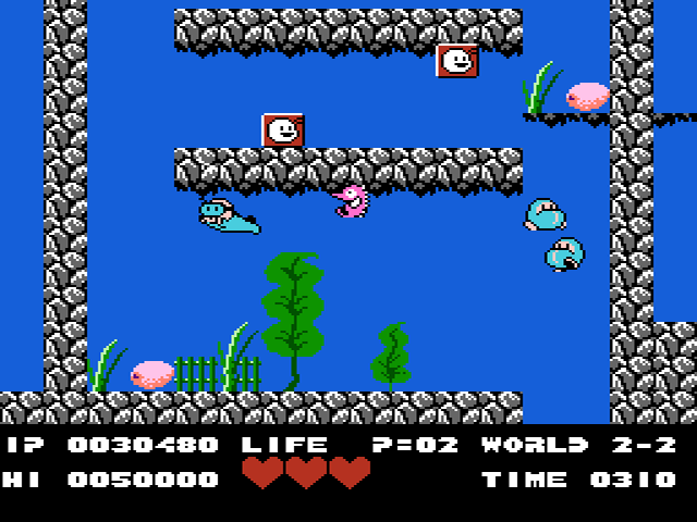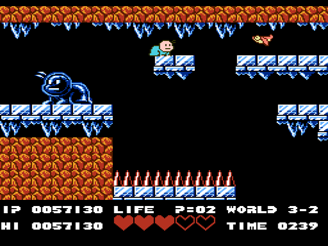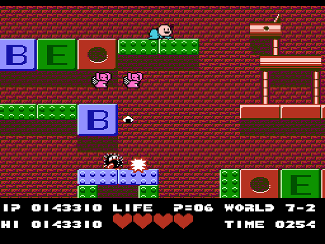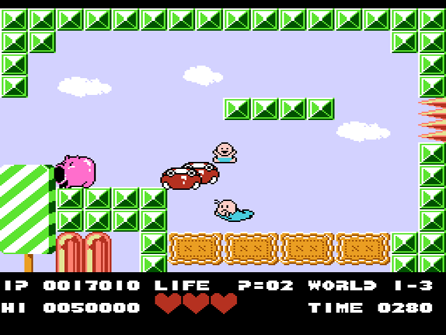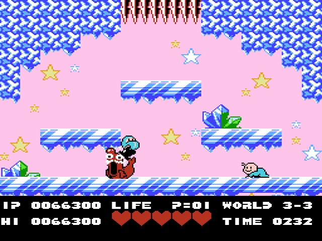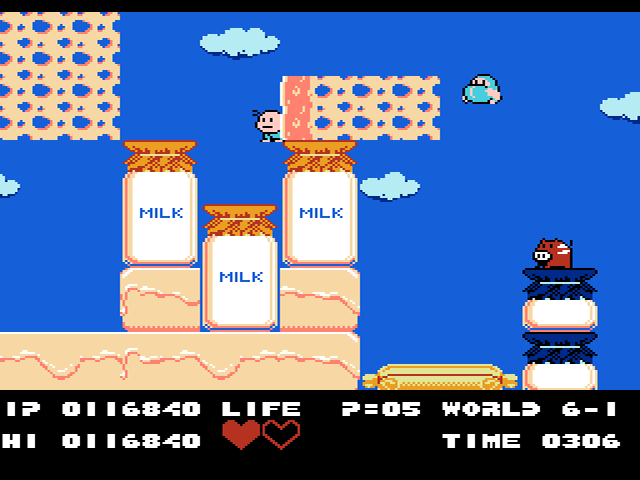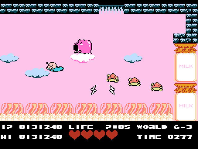 In seltenen Fällen kann man dem Spiel allerdings vorwerfen, nicht mit fairen Mitteln den Schwierigkeitsgrad in die Höhe zu treiben. Zum einen gibt es hin und wieder Stellen, die man schlicht und einfach verbocken kann, indem man zu voreilig alle vorhandenen Gegner eliminiert, die potentiell als Aufzug zur nächsten Plattform hätten dienen können. In solchen Fällen bleibt einem nur der selbstgewählte Freitod (der nächste Abgrund ist in der Regel nicht fern…) und die Hoffnung, für den nächsten Versuch aus seinen Fehlern gelernt zu haben. Zum Glück lassen sich diese Stellen über das gesamte Spiel aber an einer Hand abzählen. Zum anderen gilt es in der letzten Welt aber gleich mehrfach, sich in einer vertikalen Stage auf gut Glück ins Ungewisse fallen zu lassen… eine Reise in den garantierten Tod, sofern man nicht über entsprechende Levelkenntnisse verfügt. Die Tatsache, dass die Stages bei zweiten, dritten oder gar vierten Versuch deutlich einfacher werden, ist nicht zuletzt dem Problem geschuldet, dass man wichtige, ja gar unentbehrliche Items wie die Herzen nur allzu leicht verpasst, wenn man sich bei Verzweigungen innerhalb des Levels für die falsche Route entscheidet, denn ein Zurückscrollen des Screens ist in Bio Miracle Bokutte Upa nicht möglich. All diese Punkte sind aber eher kleinere Mankos, die den Gesamteindruck vom Titel wirklich nur im Ansatz trüben.