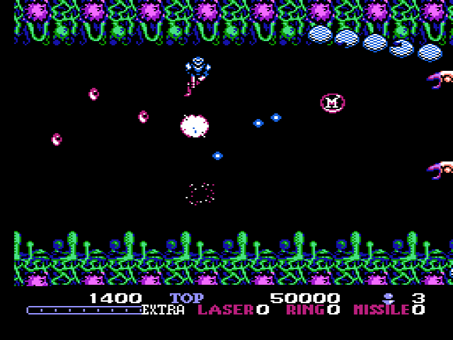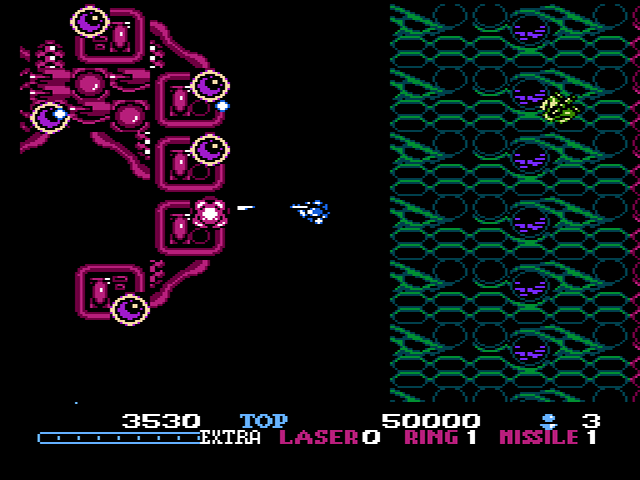 Eine weitere Besonderheit im Vergleich zu anderen Shootern ist das Waffensystem, das sich über den Spielverlauf hinweg upgraden lässt. Besiegte Gegner lassen nur allzu oft Icons mit den Aufschriften "L", "R" oder "M" (Laser, Ring und Missile) zurück. Insgesamt kann man zehn Stück dieser Icons für jedes Waffensystem einsammeln, wobei es genau genommen nur drei Stufen für jede Waffe gibt, die einen Projektile in mehrere Richtungen gleichzeitig abfeuern lässt. Man verwendet jeweils das Waffensystem, für das man als letztes ein Icon eingesammelt hat. Dadurch bleiben die beiden übrigen Waffensysteme jedoch auf dem selben Level, falls man wieder zu ihnen zurückwechseln will, man verliert also nicht die Upgrades für die jeweils alternativen Systeme durch einen Waffenwechsel. Dies ist insofern praktisch, da man sich so in den einfacheren, ersten Levels ein wenig aufpowern und zwischen den verschiedenen Waffen je nach Situation wechseln kann. Verliert man jedoch ein Leben, so gehen auch alle Upgrades für das gerade ausgerüstete Waffensystem flöten – die Upgrades der übrigen Waffen bleiben jedoch erhalten. Somit hält sich der Frust des erneuten Auflevelns in Grenzen, dies kann jedoch trotzdem nerven. Insgesamt kann man diese Spielregeln aber als fair beurteilen. Darüber hinaus gibt es noch jede Menge weitere Items einzusammeln – eine gewisse Anzahl an kleineren Diamanten beschert einem entweder Superbomben, die alle Gegner auf den Bildschirm zerfetzen, oder aber Extraleben, falls man auf den Einsatz dieser übermächtigen Waffe lang genug verzichtet. Die selten vorkommenden Schutzschilde helfen dem Helden, den unzähligen Projektilen und Scharen an Gegnern auszuweichen.