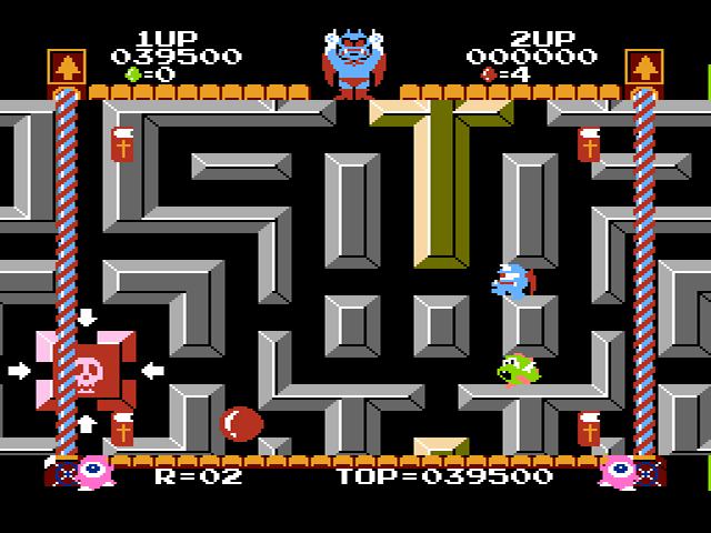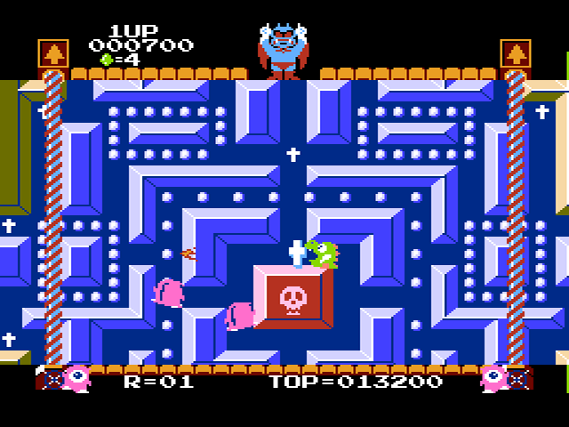 In Devil World beschließt Tamagon, ein kleiner grüner Drache, die Welt des Teufels anzugreifen. So viel zur Story, die mit einem einzigen einleitenden Bildschirm vor Spielbeginn komplett erzählt ist. Tamagon kann seinen Streifzug entweder allein angehen oder aber auch unterstützt von einer roten Kopie seiner selbst, die im Coop-Mode vom zweiten Spieler gesteuert werden kann. Wie es der Zufall so will, wohnt der Teufel allerdings nicht wie erwartet in einem höllischen Flammenmeer, sondern in einem Pac-Man-artigen Labyrinth, das bis oben hin mit kleinen Kügelchen vollgestopft ist. Dass diese von Protagonist Tamagon nach und nach verschlungen werden, daran scheint sich das personifizierte Böse doch sehr zu stören. Also lässt er seine Schergen auf den kleinen Drachen los, die ihn durch das Labyrinth jagen. Geschicktes Ausweichen und Routenplanen ist gefragt, um möglichst schnell alle verstreuten Kügelchen zu mampfen, und gleichzeitig den Verfolgern aus dem Weg zu gehen. Denn jedes Aufeinanderprallen mit ihnen bedeutet für Tamagon einen jähen Tod. Da bleibt nichts anderes übrig, als sich eins der zahlreichen Kreuze zu schnappen, um dadurch selbstverständlich die Fähigkeit zu erlangen, Feuerbälle Richtung Gegner zu spucken. Erst einmal getroffen, lassen sich die glupschäugigen Widersacher vorübergehend ebenfalls verspeisen, bevor sie sich wieder von ihren Brandwunden regenerieren. Auch die vielen Kügelchen scheinen für Tamagon ohne Kreuz zunächst unverdaulich. Ganz schön vielseitig, so ein Kruzifix. Umso schlimmer also, dass dieses Item nur zeitlich begrenzt zur Verfügung steht, so dass Tamagon nach gewisser Zeit wieder wehrlos umherstreift und sich möglichst schnell das nächste Kreuz unter den Nagel reißen sollte.