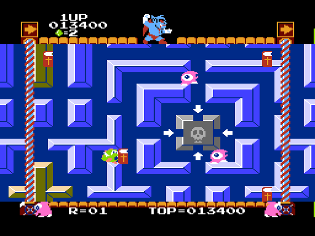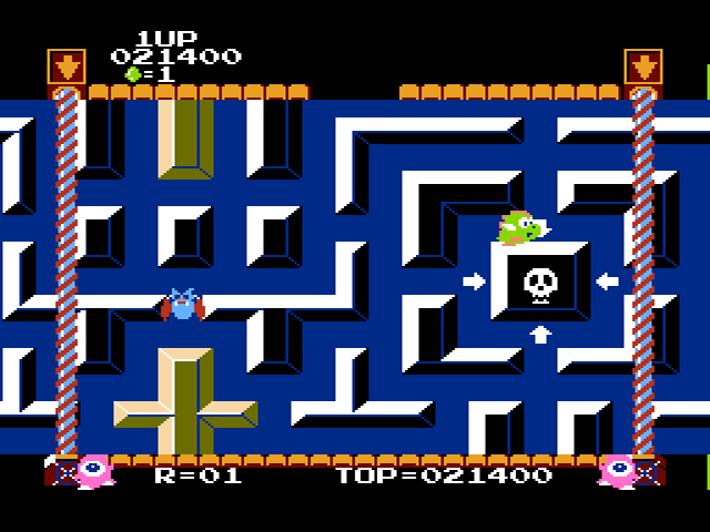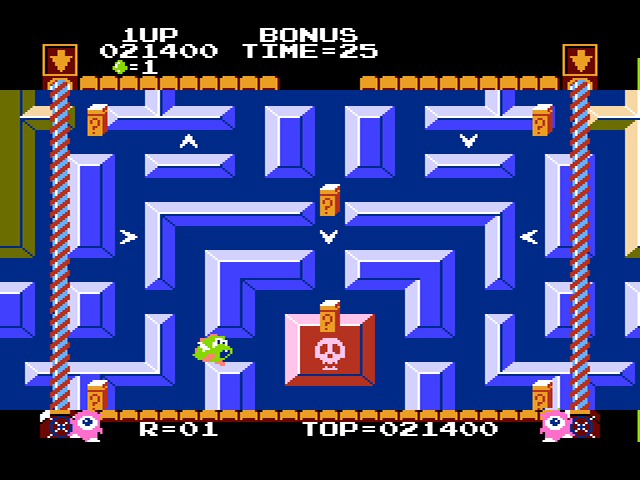 Der wirkliche Unterschied zum Spielprinzip von Pac-Man besteht nun darin, dass der begehbare Bildschirmausschnitt stets verschoben wird, und man das gesamte Labyrinth folglich erst nach und nach durchlaufen kann. Der am oberen Bildschirmrand unermüdlich tanzende Teufel gibt seinen Gefolgsleuten nämlich abstrakte Anweisungen, wie diese den aktuellen Ausschnitt des Labyrinths per Kurbelvorrichtung zu verschieben haben. Vorsicht ist also insbesondere immer dann geboten, wenn sich Tamagon zu nahe am Labyrinthrand befindet. Nicht selten wird der grüne Held nämlich von einem Richtungswechsel der Außenwand überrascht und wird dann unfreiwilliger Zeuge davon, wie sich eine missglückte Krötenwanderung über eine viel befahrene Bundesstraße anfühlt. Schafft es Tamagon allerdings, mit Hilfe der Kreuze alle herumliegende Kügelchen des Abschnitts zu futtern, winkt ein Ausflug in die zweite Runde eines jeden Levels.