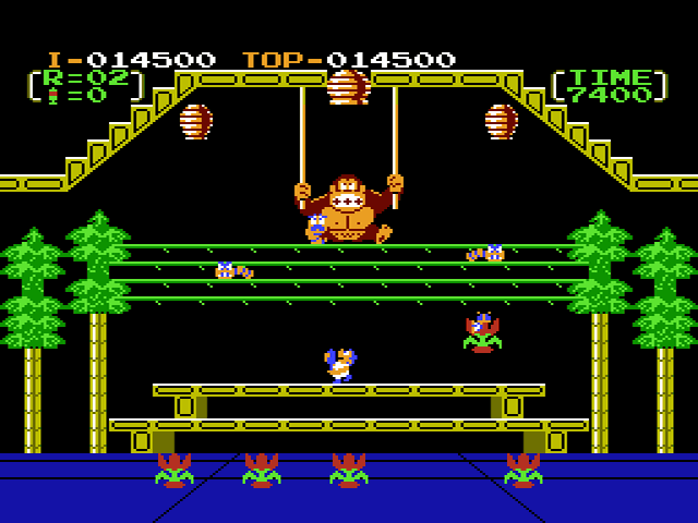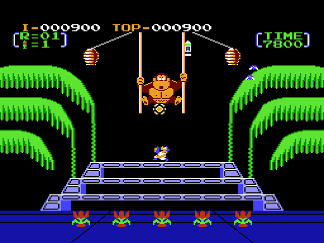 Natürlich lässt sich Donkey Kong nicht freiwillig aus seinem neuen zu Hause vertreiben, sondern sorgt höchstpersönlich dafür, dass es vor Käfern, Bienen und Wanzen im Treibhaus nur so wimmelt. Stanley muss allerdings nicht nur die ständig neu auftauchenden Insekten zurücktreiben, sondern nebenher auch Wurfgeschossen des Affen ausweichen. Nicht immer ganz einfach, da der Bildschirm meist voll von Gegnern ist und schon ein einziger Treffer für den armen Stanley tödlich endet... Um dem vorzubeugen, setzt er sich mit Insektenspray zur Wehr, das durch Einsammeln eines Power Ups sogar noch effektiver wird und dem Affen Beine macht! Ziel ist es nämlich, Donkey Kong durch gezielte Schüsse auf sein Hinterteil ans obere Ende des Bildschirms zu befördern, um einen Abschnitt zu meistern. Dabei sollte man so viele Blumen wie möglich vor dem räuberischen Ungeziefer beschützen. Die Pflanzen sind jeweils im unteren Teil des Treibhauses verteilt und werden ab und an von den Insekten entführt, sofern man diese nicht schnell genug zurück auf den Boden der Tatsachen holt. Erreicht der sich stetig nach unten bewegende Affe das Ende seiner Kletterranke, endet das Spiel ebenso abrupt für Stanley wie bei Berührung eines Insekts.