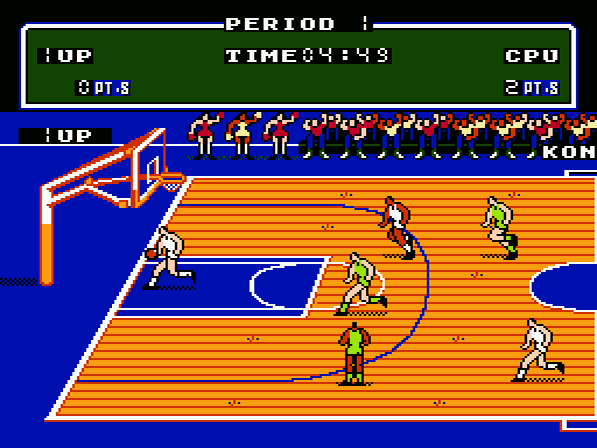 Der Spieler erblickt gleich zu Beginn das riesige Stadion, das von Tausenden von Fans von allen Seiten her in Beschlag genommen wird. Untermalt wird die Szenerie von der amerikanischen Nationalhymne, die nach besten Konami-Gepflogenheiten in hervorragender Qualität wiedergegeben wurde. So richtig patriotisch wird am Ende des Intros sogar noch die amerikanische Flagge gehisst, was zwar etwas kitschig wirkt, aber dennoch irgendwie gut in die Szene passt. Natürlich kann man das ganze auch einfach überspringen und sich direkt zu den Spieloptionen begeben, wo man einige Einstellungen für das folgende Spiel vornehmen kann. So kann der Spieler beispielsweise die Spielzeit eines Viertels (Basketball wird bekanntlich in vier Vierteln gespielt) auf fünf bis dreißig Minuten festlegen. Die Einstellung des Schwierigkeitsgrades von eins bis drei ist selbstredend und bedarf wohl keiner genaueren Erklärung. Leider stehen bei der Teamauswahl gerade mal vier Mannschaften aus der NBA zur Verfügung (New York, Chicago, Los Angeles und Boston), von denen aber beim Spiel gegen den Computer immer nur drei angewählt werden können. Boston wird fix vom Computergegner benutzt, was allerdings keine entscheidende Rolle spielt, da alle Teams in etwa gleich stark sind. Beim Spiel gegen einen menschlichen Mitspieler können natürlich beide Mannschaften frei gewählt werden, allerdings ist es nicht möglich, den Schwierigkeitsgrad zu ändern (wäre ja auch irgendwie sinnlos).