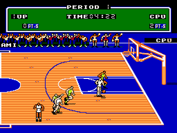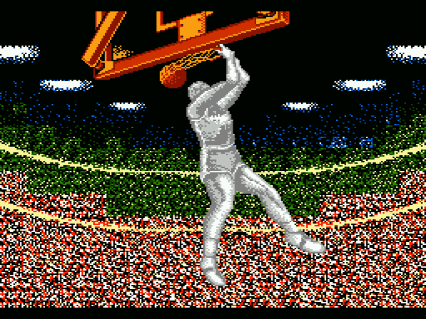 Nachdem man sich durch diese wenigen Optionen gekämpft hat, findet man sich auf dem wunderschön gestalteten Spielfeld wieder und beginnt den packenden Kampf um den Ball. Das Spielgeschehen läuft jederzeit flüssig und meistens übersichtlich ab. Wenn viele Spieler praktisch aufeinander stehen, kann es manchmal zu Flackereien kommen und man verliert das runde Spielgerät schon mal aus den Augen. Dieser Umstand kann zwar durchaus mal zu einem gegnerischen Korb führen, aber das Spiel deshalb unfair zu nennen wäre sicher falsch. Die Spielschwierigkeit geht von 120:18 bis zu "Warum kann ich den Gegner nicht verprügeln?", was auch für geübte Spieler Langzeitmotivation bedeutet. Ein Turniermodus wäre dem Thema Dauerspaß sicher sehr förderlich gewesen, doch leider hielten die Entwickler diese Möglichkeit - aus welchen Gründen auch immer - nicht für unbedingt notwendig. Die Halbzeitpause wird von einer unterhaltsamen Show attraktiver Cheerleader versüßt, wobei auch die Mannschaftsmaskottchen nicht fehlen dürfen. Ein besonderer Leckerbissen stellen auf jeden Fall die Nahaufnahmen von Dunks dar, die beim Sprung zum Korb eingeblendet werden. Man glaubt es kaum, dass diese Grafik tatsächlich vom NES stammt und wird während des Spiels immer wieder versuchen, derartige Kunstflüge hinzukriegen. Ein echter Höhepunkt!