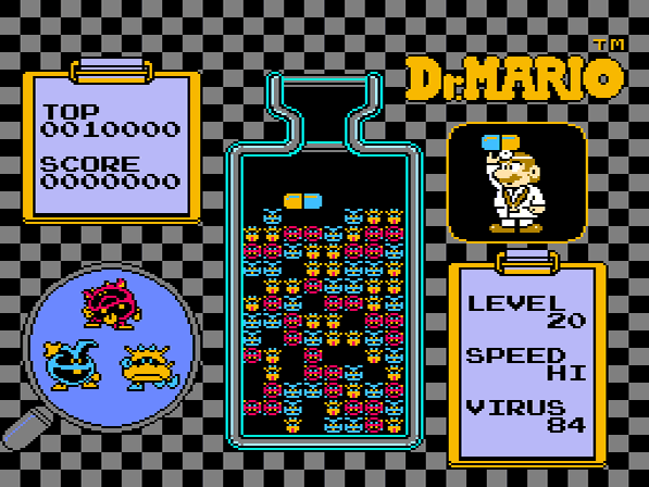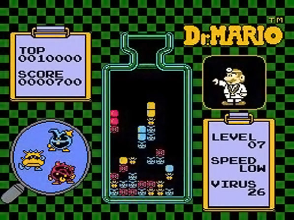 Dr. Mario wirft diese Pille in die Flasche, und nun seid ihr an der Reihe. Eure Aufgabe ist es, die von oben herabfallende Pille einem gleichfarbigen Virus zuzuordnen. Schafft ihr es, 3 Pillenelemente an den Virus heranzusetzen (egal ob von oben, seitwärts oder von unten), verschwindet sie mitsamt den Pillen. Kleben allerdings mehrere Viren gleicher Farbe, so reichern auch geringere Dosen, beispielsweise werden 2 Viren bereits mit 2 Pillenelementen gekillt.