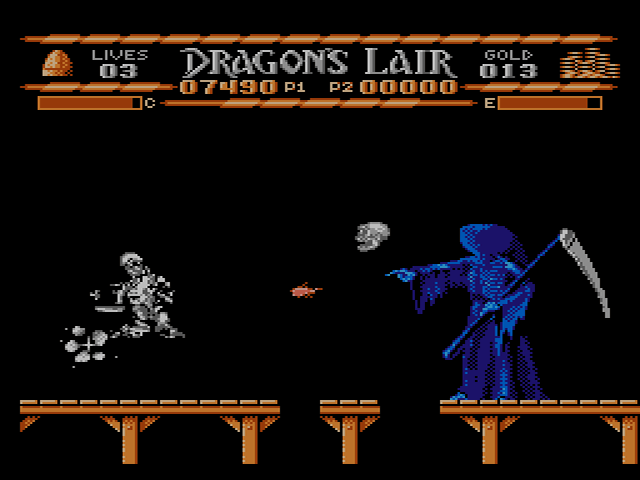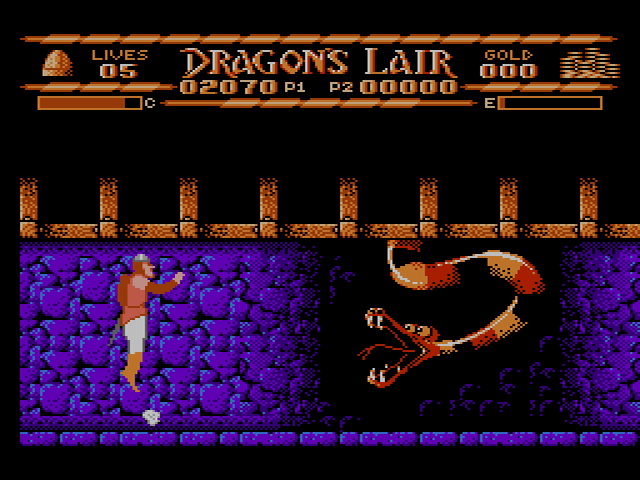 Kommen wir nun zur Steuerung. Anscheinend Elite-typisch wird die Standard-Steuerung der Mehrheit der NES-Titel (A = Springen, B = Angriff) ignoriert und umgedreht, ist aber im Prinzip nicht weiter schlimm. Wesentlich ärgerlicher ist dagegen, dass die Ausführung der befehligten Aktion erst nach einer Verzögerung durchgeführt wird, was in den zwar sehr detaillierten, aber auch zeitlich in die Länge gezogenen Animationen begründet liegt. So braucht es ein unheimlich gutes Timing, um den gegnerischen Attacken rechzeitig auszuweichen - liegt ihr einen Sekundenbruchteil daneben, bedeutet dies in jedem Fall den sicheren Tod. Ja genau, den Tod, denn Dirk kann - abgesehen von einigen kleineren Widersachern, die an der Energieleiste zerren - nicht mal einen Treffer einstecken, ohne sich gleich in einen Haufen Knochen aufzulösen. Kommt noch hinzu, dass die Feinde oftmals erst sehr spät zum Vorschein kommen. Gepaart mit der verzögerten Steuerung und der körperlichen Schwäche Dirks unheimlich frustrierend.