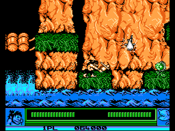 Alternativ zur Axt kann Joe auch noch weitere Waffen von feindlich gesinnten Höhlenmenschen ergattern. So gibt es beispielsweise einen Bumerang, einen Stein, ein Rad und auch Feuer, wobei besonders die beiden letzteren überaus effektiv sind. Mit etwas Glück findet Joe zwischendurch mal etwas essbares, wie ein Apfel, eine Melone oder auch einen Hamburger, was die Energie wieder etwas in die Höhe treibt. Diese Power-Ups kommen jedoch nur überaus selten vor...
