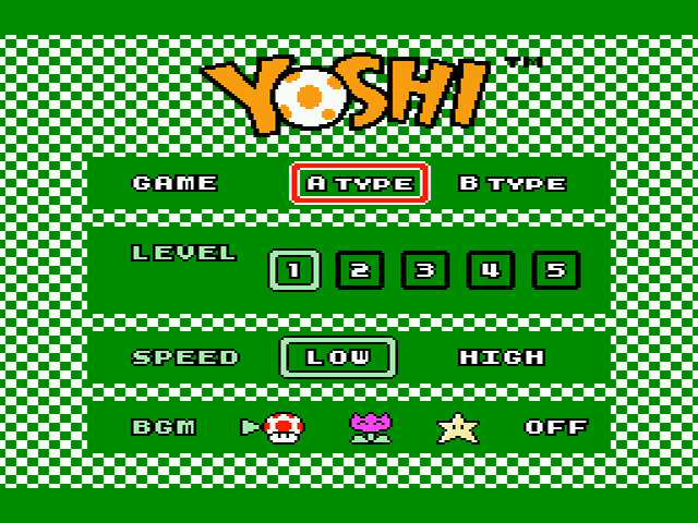 Wie schon aus anderen Puzzle-Games bekannt, gibt es einen A- und einen B-Modus. Im A-Modus geht es schlicht und ergreifend darum, zu testen, wie lang man am Stück spielen kann, wie viele Punkte man erreicht und wie viele Yoshis man schlüpfen lässt, bis man einmal den oberen Bildschirmrand erreicht hat. Dieser Marathonmodus kann rein theoretisch unendlich lange andauern, verlangt mit steigendem Level aber auch immer mehr Konzentration, Schnelligkeit und Fingerfertigkeit ab. Im B-Modus startet man mit bereits vorhandenen Blöcken auf dem Spielfeld und Aufgabe ist es, den gesamten Bildschirm so schnell wie möglich komplett frei zuspielen, um ins nächste Level zu gelangen. Dort beginnt das Spielchen dann von neuem, nur dass das Unterfangen von mal zu mal schwieriger wird. Für ein erfolgreich absolviertes Level gibt es im Gegensatz zum A-Modus noch einmal Extrapunkte. Auch hier ist das Spiel beendet, sobald die Blöcke den oberen Bildschirmrand berühren. Für beide Modi lassen sich im Vorhinein übrigens ein paar Einstellungen treffen: Man kann auf einem Level zwischen 1 bis 5 starten und zwischen zwei Geschwindigkeitsstufen und drei verschiedenen Musikstücken wählen. Wer möchte, kann den Sound auch ganz ausstellen. Für beide Spielmodi gibt es außerdem eine Highscore-Liste, welche jeweils die besten drei Ergebnisse angibt. Da dem Modul aber ein integrierter Speicher fehlt, gehen die Scores nach dem Ausschalten der Konsole wieder verloren.