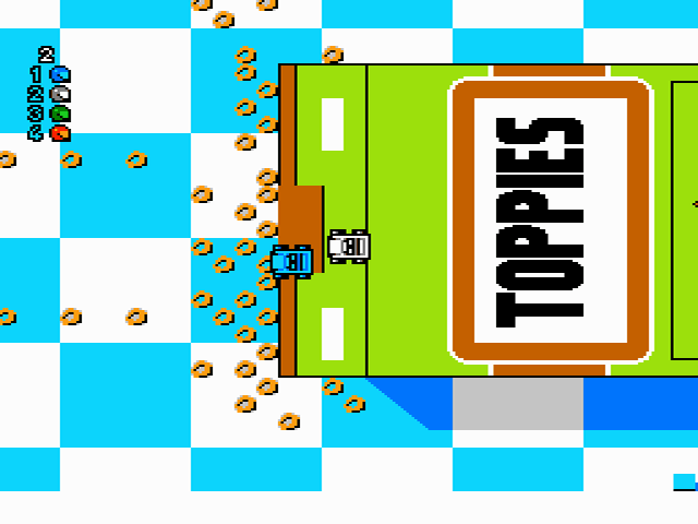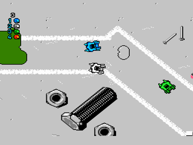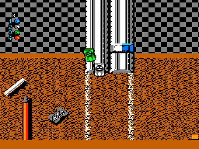 Während des Rennens darf gnadenlos geschoben, geschubst und gestoßen werden. Dabei kommt es vor, dass mal ein Fahrzeug vom Tisch fällt oder in die Luft geht - in diesem Falle vergehen wertvolle Sekunden, bis euer Vehikel wieder einsatzbereit auf der Piste steht. Passiert euch das in den 3 Runden, die pro Rennen ausgetragen werden, zu oft, so werdet ihr kaum Chancen auf den Sieg haben. Ziel in jedem Rennen ist es, auf den ersten oder zweiten Platz zu fahren und so die Qualifikation für die nächste Runde zu schaffen. Landet ihr auf Platz 3 oder 4, müsst ihr das Rennen wiederholen und dabei eines der zu Beginn 3 Continues einsetzen. Sind diese aufgebraucht, heißt es unweigerlich Game Over. Jedoch habt ihr alle paar Rennen in einem Bonusspiel die Chance, ein zusätzliches Continue zu ergattern. Ihr müsst dabei einen Micro-Monster Truck innerhalb eines knappen Zeitlimits durch einen mit Pfützen und Unkraut übersäten Garten lenken.