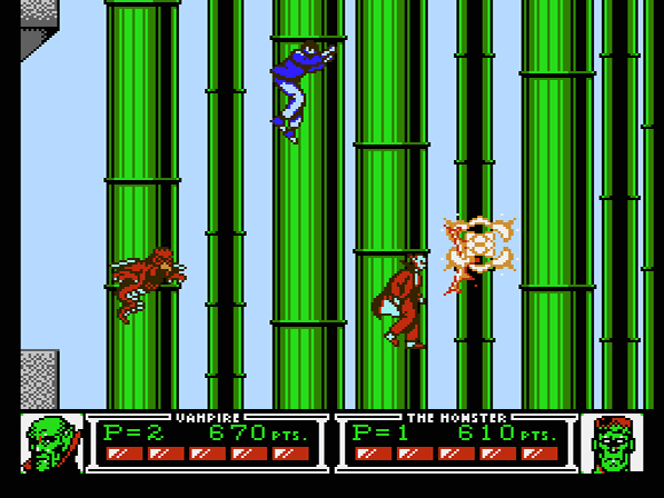 Auch innovative Elemente und Abwechslung im Gameplay und Leveldesign sucht man vergeblich. Das höchste der Gefühle sind noch eine Art Bootsfahrt auf einer durch die Kanalisation schippernden Getränkedose (vom Dosenpfand war in den 90ern noch keine Rede) und das Hinablaufen einer Rampe, die einen kurzzeitig derart beschleunigen lässt, dass man meint, mit einem gewissen blauen Igel durch die Green Hill Zone zu flitzen. Ansonsten bietet der Titel die übliche Kost, wie etwa sich hebende und wieder absenkende Plattformen – ihr ahnt es: das Spiel bietet nichts, was man so nicht schon, in ausgereifterer Form, in anderen Titeln gesehen hätte. Denn es sei erwähnt, dass ihr in MiMP teilweise auch auf unfaire Stellen stoßt. Etwa die endlos respawnenden Widersacher erscheinen manchmal direkt vor dem Protagonisten, wodurch ein Zusammenprall unausweichlich scheint. Und auch der Doppelsprung will nicht immer reibungslos von der Hand gehen – im besten Fall wird einem dies nur ein bisschen Energie stehlen. Im schlimmstem Fall kostet dies jedoch vor allem eins: Nerven. Denn einige Abgründe sind nur mit dem Doppelsprung zu überwinden. Entsprechend wenig unterhaltsam ist es, wenn man mitten in der Luft feststellt, dass der Held partout nicht zum zweiten Sprung ansetzen will. Des weiteren erleiden die Spielfiguren bei Gegentreffern Rückstöße á là Castlevania, die einen in Nähe von Abgründen durchaus auch mal in die ewigen Jagdgründe schicken und somit für weitere Instant Deaths sorgen. Fairerweise muss man aber sagen: Ganz so problematisch wie in Konamis Vampirjagd ist dies bei MiMP aufgrund der spielerfreundlicheren Levelstruktur und der etwas geschmeidigeren Steuerung nicht.