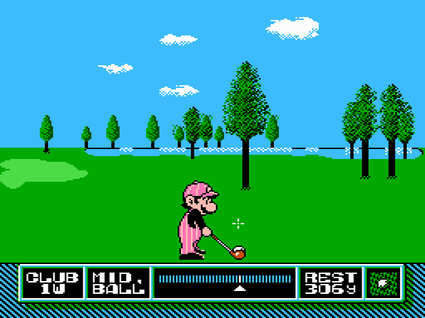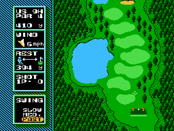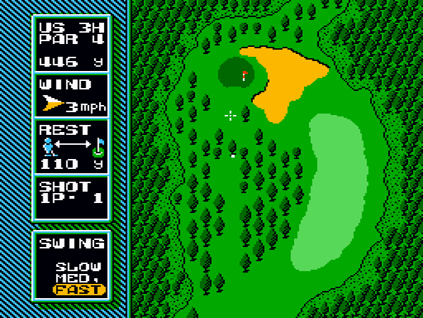 Egal in welchem Modus man sich befindet, so bleibt das eigentliche Gameplay hiervon unberührt. Die bereits im Vorgänger „Golf“ implementierte Schlagleiste kehrt in NES Open Tournament Golf zurück und hat sich bis heute als echter Genrestandard etabliert: Bei Abschlägen läuft nach dem ersten Druck auf den A-Knopf ein Punkt auf der Leiste nach links, bis man mit einem zweiten Drücken die Schlagkraft festgelegt, woraufhin der Punkt wieder nach rechts läuft, wo mit einem letzten Knopfdruck so genau wie möglich eine Markierung getroffen werden sollte, was die Genauigkeit des Schlags beeinflusst. Hört sich zunächst kompliziert an, hat man das Timing aber erst einmal raus, schlägt man die Bälle mit gewünschter Härte ohne Ausschlag nach links oder rechts aufs Grün. So zumindest die Theorie. Weitere Elemente wie die Wahl des richtigen Schlägers (nicht jeder Untergrund ist für jeden Schläger gleich gut geeignet), die korrekte Berücksichtigung des Windes und die Platzierung eines Spins auf dem Ball sorgen für Spieltiefe und Anspruch. Anders als in neueren Golfspielen gibt es jedoch keine Anzeige, wie weit der Ball voraussichtlich fliegen wird, was so mancher Anfänger schmerzlich vermissen wird. Ein mehr oder weniger gelungenes Risk-and-Reward-Element ist die Auswahl der Schlaggeschwindigkeit, bei der man zwischen drei Stufen wählen kann. Je höher die vorab ausgewählte Geschwindigkeit, desto schneller bewegt sich der Punkt auf der Schlagleiste und desto schwieriger wird es, punktgenaue Treffer zu landen. So drischt man den Ball auf der höchsten Stufe zwar vermeintlich weiter, allerdings besteht auch erhöhte Gefahr, dass man ihn mit voller Gewalt abseits des beabsichtigten Pfades prügelt. Andererseits können die gewonnenen Extra-Yards an Entfernung mitunter darüber entscheiden, ob man auf einem 5er-Loch einen „Eagle“ (zwei Schläge unter Par) überhaupt in Angriff nehmen kann, oder nicht.