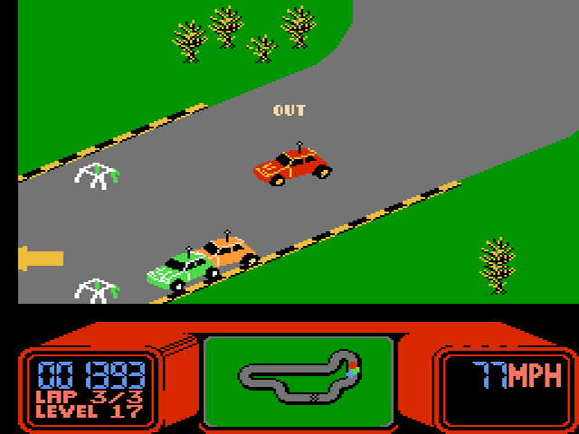 Kontrolliert werden die Wagen mit der linken und rechten Richtungstaste des Steuerkreuzes. Mit B wird Gas gegeben und A erlaubt den Einsatz aufgesammelter Items. Nach kurzer Eingewöhnung geht die Steuerung flott von der Hand und eure Flitzer lassen sich prima über die Rennstrecken manövrieren. Diese sind dank der isometrischen Perspektive stets übersichtlich und sorgen - wie auch die schicken Fahrzeugsprites - für ein stimmiges Gesamtbild. Musikalisch wird euch außer der Titelmusik von Dave Wise und einigen flotten Jingles leider nicht viel geboten. Stattdessen untermalen Motorengeräuschen und gute Soundeffekte die Rennen.