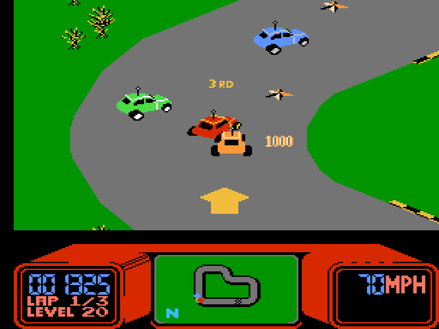 Wer jetzt denkt, dass er sich hier in einen teuren Schlitten setzt und mit anderen Rennwagen um die Wette flitzt, der täuscht sich. Wie es der Name vermuten lässt, gehen hier ferngesteuerte Autos an den Start (R.C. steht für Remote Control) und liefern sich in isometrischer Perspektive erbitterte Gefechte. Jeweils 4 Fahrzeuge bestreiten ein Rennen über eine je nach Kurs unterschiedliche Anzahl Runden. Wer unter die ersten 3 kommt, darf sich über die Qualifikation für das nächste Rennen sowie einen in der Zwischensequenz angezeigten Pokal freuen. Wer auf den letzten Platz fährt, für den hat der Rennspaß ein jähes Ende. Dank zwei Continues gibt es aber dennoch noch Hoffnung auf ein Weiterkommen.
