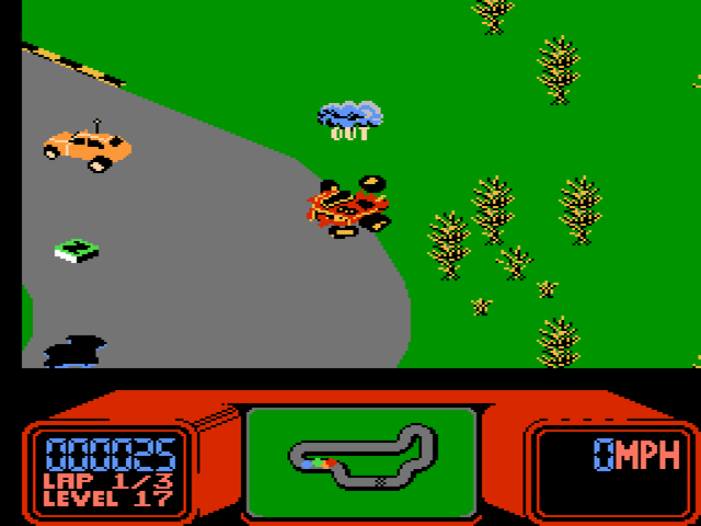 Kontrolliert werden die Wagen mit der linken und rechten Richtungstaste des Steuerkreuzes. Mit B wird Gas gegeben und A erlaubt den Einsatz aufgesammelter Items. Nach kurzer Eingewöhnung geht die Steuerung flott von der Hand und eure Flitzer lassen sich prima über die Rennstrecken manövrieren. Diese sind dank der isometrischen Perspektive stets übersichtlich und sorgen - wie auch die schicken Fahrzeugsprites - für ein stimmiges Gesamtbild. Musikalisch wird euch außer der Titelmusik von Dave Wise und einigen flotten Jingles leider nicht viel geboten. Stattdessen untermalen Motorengeräuschen und gute Soundeffekte die Rennen.