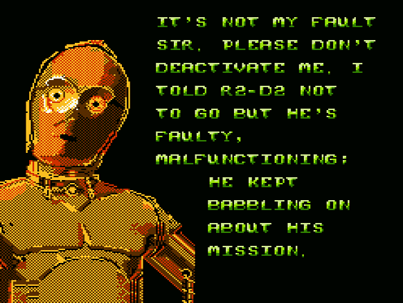 Generell der Gattung des Jedis angehörend stellte Star Wars selbstverständlich ein Pflichtkauf für mich dar: Bei dem tollen musikalischen Thema, dem einleitenden Rolltext, dem Angriff des Sternenzerstörers auf die Tantive IV wird einem als Liebhaber warm ums Herz, ABER dieses Spiel hat eindeutig Chancen verspielt, es hätte soviel mehr werden können. Ein Soundeffekt hier, ein Zufallsgenerator da, gespickt mit weiteren Animationsphasen hätten die Wertung nach oben schnellen lassen. Ebenso vermisse ich ein Highscore-System oder vergleichbare Features, dies hätte positiv zum Replayfaktor beigetragen. Na ja, nichtsdestotrotz ein überdurchschnittliches Actionspiel mit einem extrem fordernden Finale *schwitz* ;o)