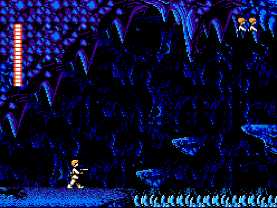Trotz der spielerischen Beschränktheit, sprich mangelnde Fähigkeit, Lebenseinheiten für sich zu beanspruchen, verfügen Han und Leia gegenüber dem Farmerjungen Skywalker über wesentlich vorteilhaftere Argumente, wie einer höheren Schusskraft. Speziell die Dame mit der Kringelfrisur kredenzt ein weiteres explizites, die Waffe einer Frau nutzendes Attribut. Sowohl in dem Raupenschlepper der Jawas als auch während den metallisch gerüstartigen Levelkonstruktion der imperialen Superwaffe erfährt der Spieler innerhalb einiger Passagen eine Abnahme der Schwerkraft bzw. einen durch Luftsoge hervorgerufenen Schwebezustand. Hierbei wird der voluminöse Rock des Blaubluts - ähnlich Prinzessin Toadstool in Super Mario Bros. 2 - zum Fortbewegungsmittel, welches die Flugbahn um bedeutungsvolle Meter zu verlängern vermag. Denn allein Pixel entscheiden in Star Wars für das Nintendo Entertainment System zwischen Frust und Lust: Zwar sind die Plattformen deutlich erkennbar, dennoch liegen sie leicht unter den Größenverhältnissen eines durchschnittlichen Jump 'n' Runs. Dies ist speziell in den Grotten auf Tatooine oder innerhalb der Todessterntrakte ein zum hohen Schwierigkeitsgrad beitragender Faktor.