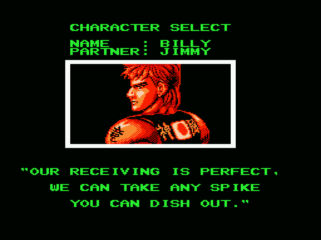 Nachdem man das Titelbild von Super Spike V’Ball zum ersten Mall weggedrückt hat, meint man, man säße vor einem auf Windows laufenden Heimrechner, der mal wieder streikt: Auf einem blauen Hintergrund nämlich werden einem hier die zu Verfügung stehenden Spielmodi präsentiert: So gibt es zum einen den Turniermodus, in dem man entweder allein oder gemeinsam mit einem Freund ein Volleyballmatch nach dem anderen bestreitet, um irgendwann im Finale zu siegen und selbst ganz oben zu stehen. Zum anderen gibt es noch einen Mehrspielermodus, in dem sich via Four Score, dem offiziellen NES 4-Spieler Adapter, sogar bis zu vier Spieler duellieren können!