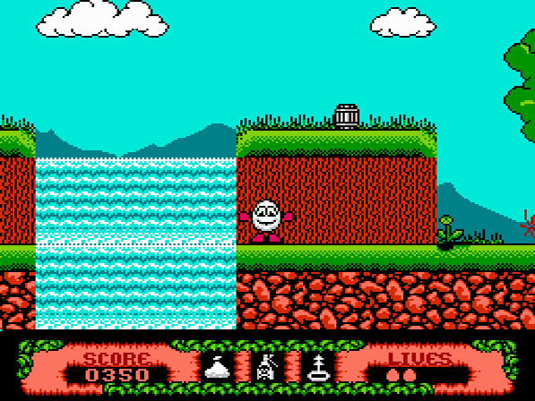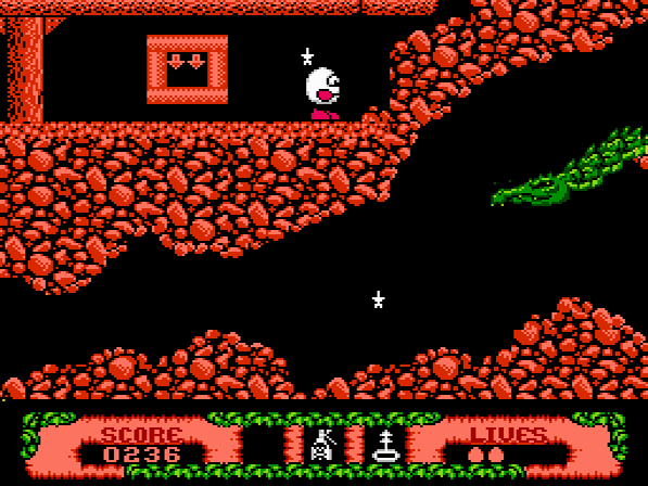 Nebenbei: Von diesem Spiel existieren verschiedene Versionen für das NES. Die erste erschien in den USA als Modul und weist im Vergleich zu den späteren Release einige Unterschiede auf. So müsst ihr lediglich 100 Sterne einsammeln, die Items an anderen Orten aufspüren oder euch mit einem leicht veränderten Leveldesign herumschlagen. Zudem ist Dizzy zu Fuß extrem langsam unterwegs. Mit den späteren Versionen für Europa und den Aladdin Deck Enhancer (ein von Codemasters entwickeltes Zubehör) wurden die verschiedenen Anpassungen dann vollzogen. Aber auch für Europa existieren 3 unterschiedliche Varianten: Zum einen erschien das Spiel als Plug Thru-Titel und zum anderen als schwarzes Modul, von welchem es wiederum 2 Versionen gibt. Während die eine das „normale“ Spiel enthält, so ist die neuere Version mit verschiedenen Sprachen (u.a. auch Deutsch) ausgestattet. Äußerlich unterscheiden sich die Modulvarianten jedoch nicht voneinander.