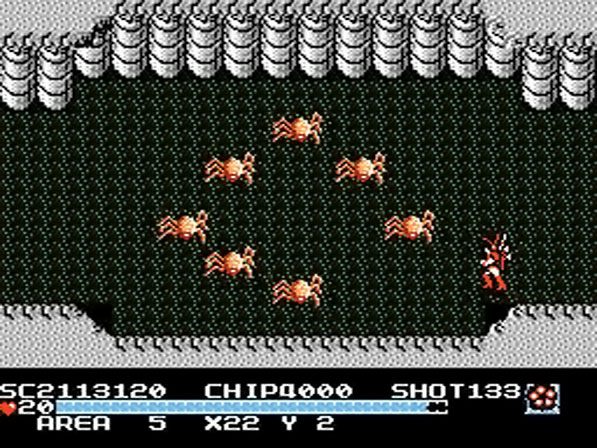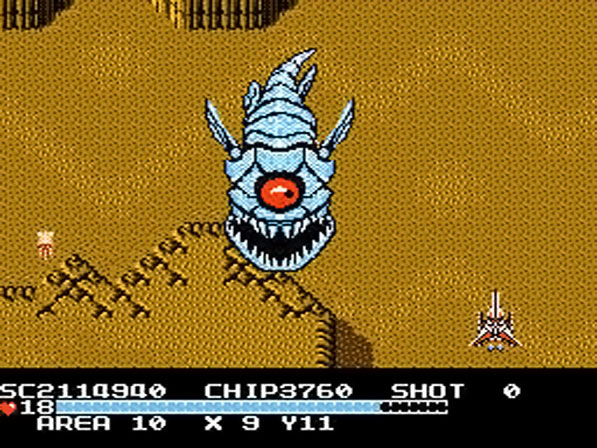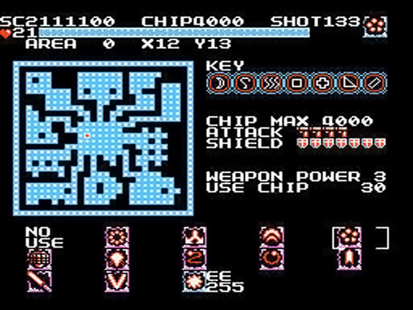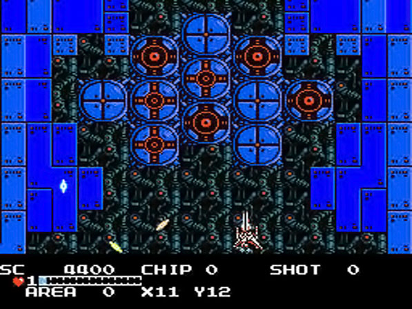 Das Ziel auf der Oberwelt ist es eigentlich, sich durch diverse Items aufzupowern und, sofern noch nicht geöffnet, die Eingänge zu den Korridoren, welche die Shooter-Levels darstellen, freizulegen. Dies geschieht anhand eines kleinen Rätsels, welches sich aber immer leicht durch die Tipps, die man in speziellen Erholungsräumen erhält, lösen lässt. In jedem Areal gibt es zwei Korridore, insgesamt kommt man in The Guardian Legend auf 21 verschiedene Levels bester Shooter Qualität :). Diese sind, ebenfalls wie die ihnen jeweils obergeordneten Areale, in verschiedene Kategorien eingeteilt, nach der sich die Musikstücke, die Monster, die Bosse und die Landschaft richten. Neben der normalen Zone gibt es noch folgende: Die Tiefen der Unterwasserwelt, die dunklen Wälder, riesige Kristalllandschaften, organische Strukturen und die ewige Dürre der Wüsten. Um in eines dieser Areale eintreten zu dürfen, benötigt man allerdings einen Schlüssel, den man für gewöhnlich im vorherigen Korridor gefunden hat.