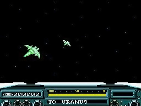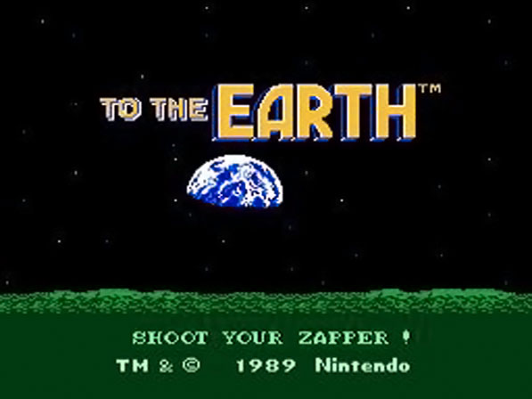 To the Earth ist einer der wenigen Lightgun Shooter für das Nintendo Entertainment System und kann folglich ausschließlich mit dem NES Zapper gespielt werden. Die Story des Spiels könnte an die eines steinalten Science-Fiction Films angelehnt sein: Der Spieler schlüpft in die Rolle eines Astrofighter-Kommandanten und hat die Aufgabe, auf dem Weg vom Planeten Uranus bis hin zur Erde das Weltall von bösen Aliens zu befreien. Wir schalten die Konsole ein, das Titelbild wird eingeblendet und ein Jingle ertönt. Wartet ihr ein wenig, wird noch ein kurzes Intro abgespult, in dem gezeigt wird, wie eine feindliche Raumflotte zur Erde vordringt und euer Astrofighter als letzte Rettung abhebt. Durch Schuss auf den Bildschirm startet ihr wie gewöhnlich das Spiel. Los geht's!
