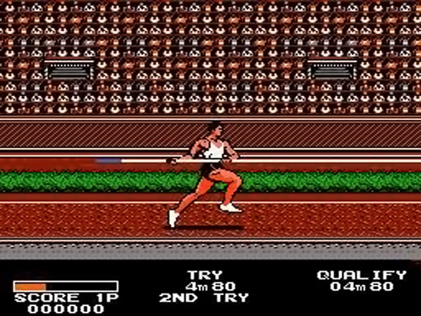 Alle 4 Jahre beglücken uns die olympischen Spiele. 1988, also im selben Jahr indem auch die olympischen Spiele in Südkorea stattfanden, brachte der japanische Hersteller Konami, der Spieleserien wie Gradius, Castlevania oder Probotector erschaffen hat, den zweiten Teil von Track & Field in die Verkaufsregale. Nun konnte man also noch einmal dieses sportliche Ereignis selbst nachspielen. In insgesamt 15 Disziplinen könnt ihr beweisen, dass ihr genauso wie die großen Sportler das Zeug zum Sieger habt. Vom Fechten bis zum Tontaubenschießen ist wirklich alles mit dabei. Bei den Disziplinen kommt es überwiegend darauf an, durch schnelles Triggern seine Poweranzeige aufzufüllen. Je öfter ihr den Knopf drückt, desto schneller rennt euer Sportler beispielsweise. Mit der Fähigkeit dies auch eine gewisse Zeit lang durchzuhalten, habt ihr schon die halbe Miete. Bekommt ihr aber beim Triggern einen Fingerkrampf, habt ihr Pech und der Athlet bleibt schnell stehen. Zusätzlich müsst ihr auch mal im richtigen Moment den B-Knopf betätigen, um z.B. über die Wasserbecken beim Hürdenlauf zu springen oder den Stab beim Hochsprung richtig einzusetzen.