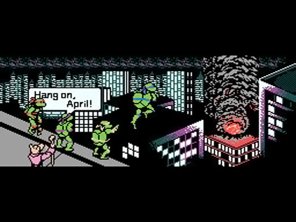 Der Wolkenkratzer von Kanal 6 steht in Flammen und April befindet sich noch immer im innern des Gebäudes. Mit einem der 4 Helden stürzt ihr euch in die Flammen und wollt die Reporterin retten. Doch dort zeigt sich wer hinter dem Feuer steckt: Niemand anders als der Footclan, mit seinem Anführer Shredder. Klar macht man sich sofort über die Bande her, doch bevor man Rocksteady erledigt hatte, machte sich Shredder schon mit der Reporterin aus dem Staub. Natürlich lassen die Turtles ihre Freundin nicht im Stich und machen sich sogleich auf die Suche.