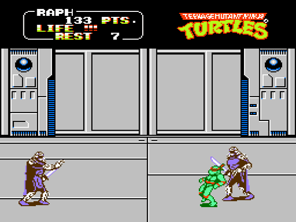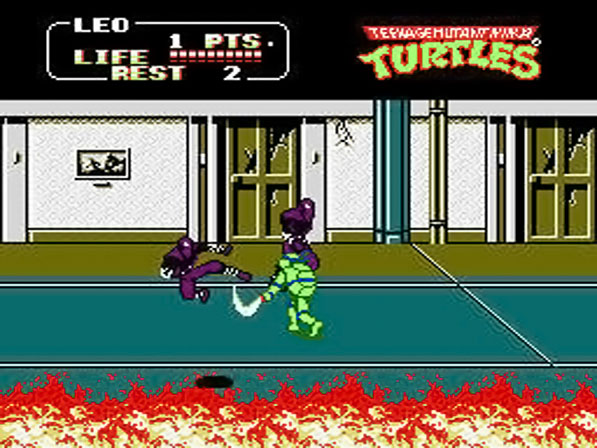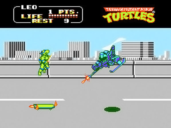 Der Weg bis dahin ist lang, doch dank ihrer ausgeklügelten Kampftechniken können es die Turtles schaffen. Da wäre einmal der normale Angriff mit der individuellen Waffe auf den Gegner. Außerdem beherrschen die Turtles einen Sprungkick, mit dem sich auch distanzierte Gegner sehr gut angreifen lassen. Und last but not least steht auch noch ein Spezialangriff zur Verfügung, bei dem die Gegner im Springen mit den Waffen attackiert werden. Dies ist die effektivste Methode, um den Footclan-Mitgliedern am schnellsten den Garaus zu machen. Doch auch die besten Kämpfer werden irgendwann mal ein bisschen müde, doch dem schaffen die ab und zu herumliegenden Pizzas Abhilfe. Sie füllen die ganze Energieleiste des Helden auf. Eine weitere Möglichkeit, den Kampf der Turtles zu verlängern ist das Ergattern von Extraleben. Diese erhält man für 200 besiegte Gegner.