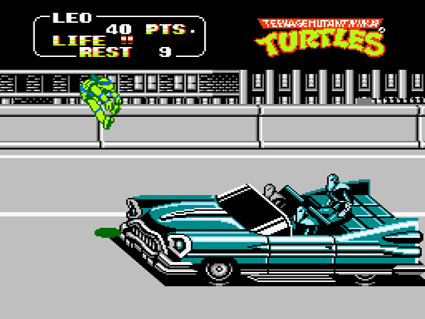 Diese führt sie neben der schon fast obligatorischen Kanalisation, unter vielem anderen auch auf einen Highway, in ein Parkhaus und schlussendlich natürlich ins gigantische Technodrom. Zwischendurch gönnen die Schildkröten aber ihren Füssen mal eine Pause, schnappen sich ihr Skateboard und rasen damit in Manhatten umher. Insgesamt 10 Levels warten auf die grünen Helden, die natürlich voll mit Shredders Gesindel sind. Vor allem die bekannten Fuß-Soldaten treiben ihr Unwesen, natürlich meist zu Fuß, aber auch mal im Hubschrauber, im Auto oder auf dem Motorrad unterwegs machen sie den Turtles ihre Rettung nicht gerade leicht. Daneben sind natürlich auch die gefürchteten Mousers anzutreffen, welche vor allem von Master Splinter gefürchtet sind. Dieser wird zu einem späteren Zeitpunkt auch prompt von den kleinen Robomäusen entführt.